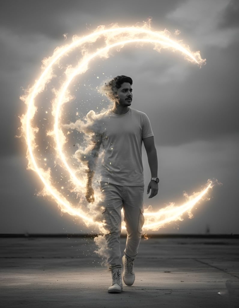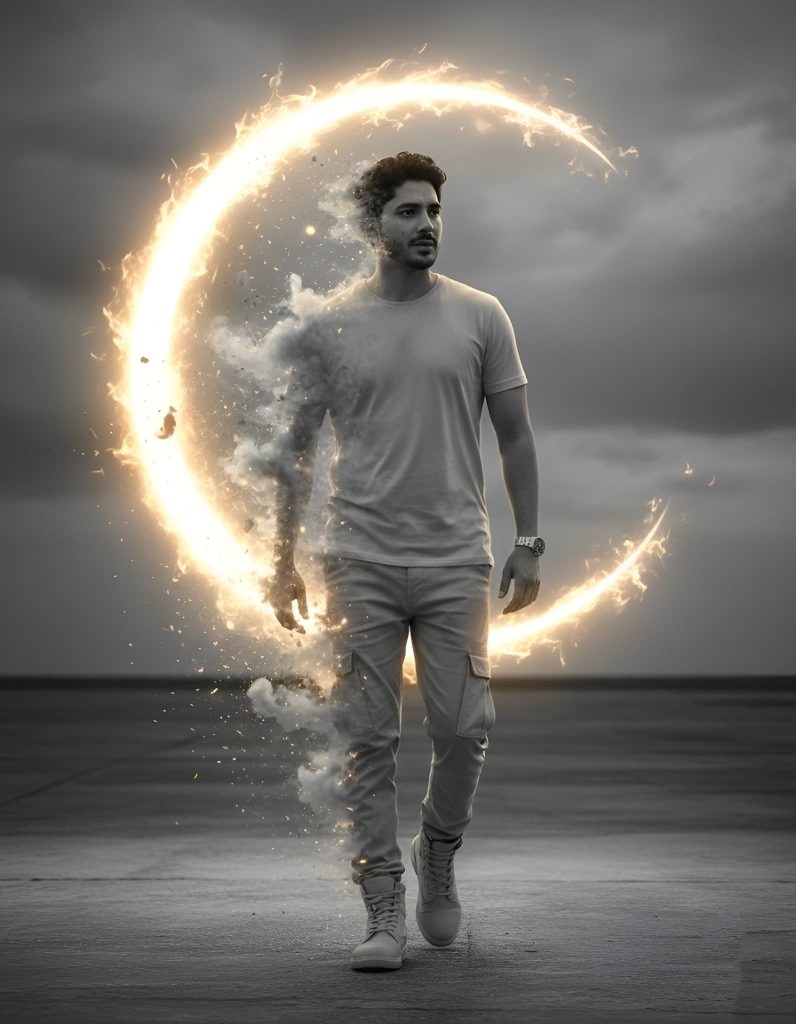 This prompt is designed to show movement. By placing the man “one step ahead” and “facing front walking,” we create a dynamic composition. The “C-shaped energy aura” acts as a powerful rim light that catches the edges of his hair and shoulders.